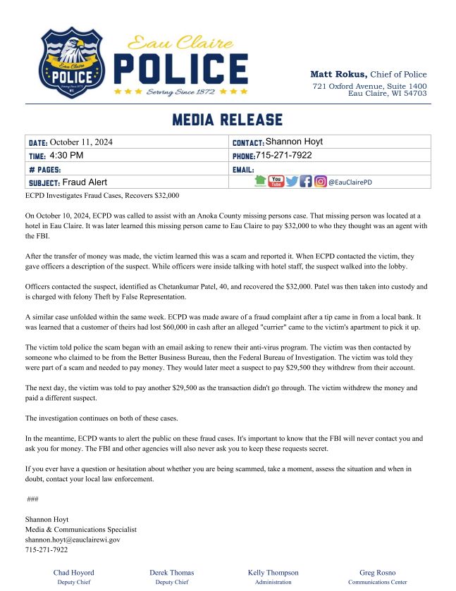 On October 10, 2024, ECPD was called to assist with an Anoka County missing persons case. That missing person was located at a hotel in Eau Claire. It was later learned this missing person came to Eau Claire to pay $32,000 to who they thought was an agent with the FBI.